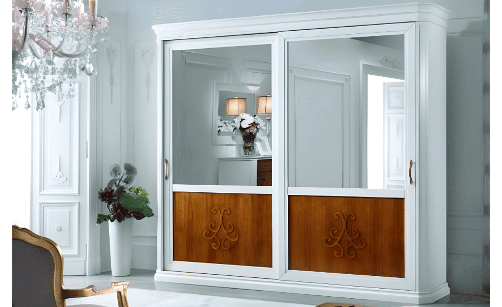 Specchi: Le ante con specchi a tutta altezza donano luce e profonditร , alleggerendo visivamente le grandi dimensioni del mobile.