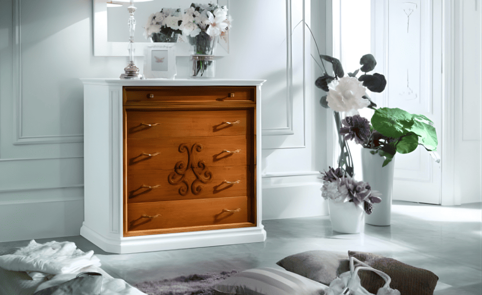 Il Gruppo Comรฒ e Comodini: Il comรฒ (L.125 H.115 P.56 cm) si distingue per i 5 cassetti (invece dei classici 3 o 4), offrendo una praticitร senza pari. Le linee riprendono la soliditร e le cornici lavorate della collezione, garantendo una coerenza stilistica perfetta.
