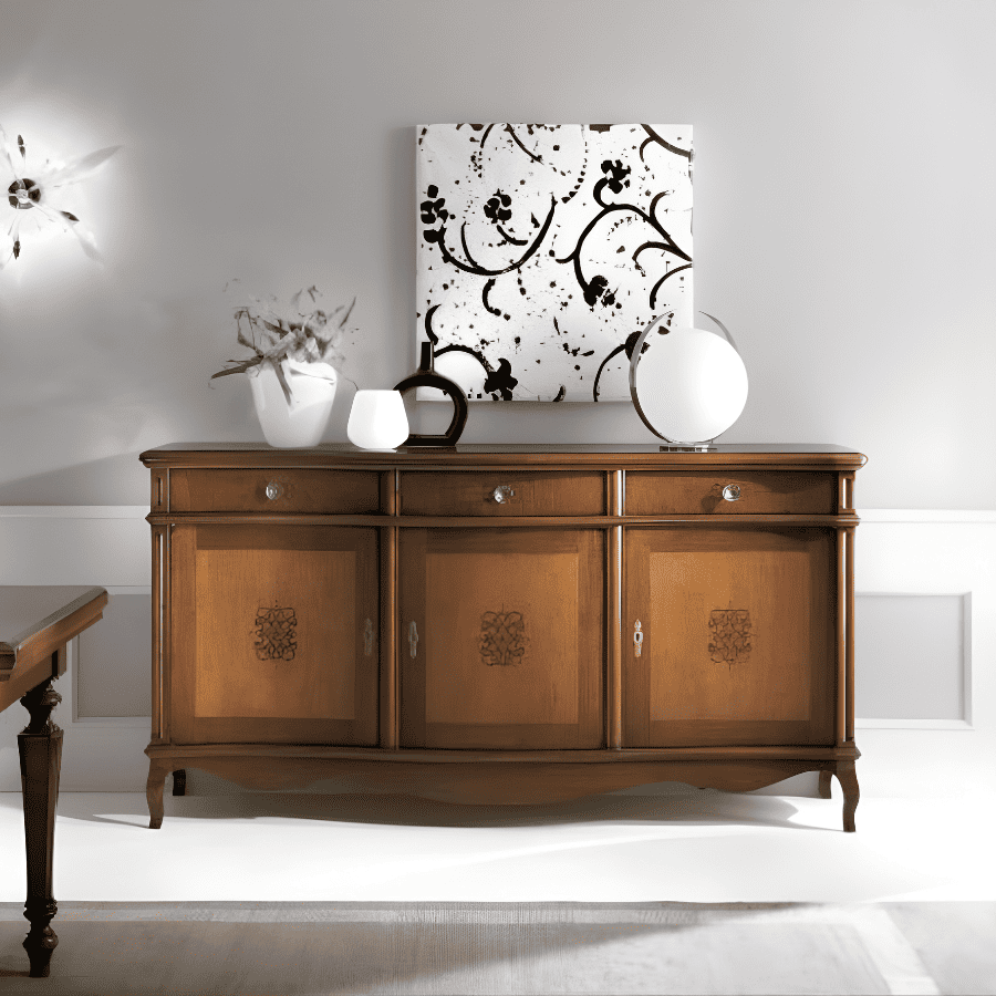 Raffinata credenza modello Giglio a 3 porte e 3 cassetti, un pezzo d’arredo che si distingue per le sue ante curve. Questa lavorazione particolare ammorbidisce le linee del mobile, eliminando la rigiditร delle forme squadrate e donando armonia all’ambiente. Con dimensioni di L.198 P.56 H.102 cm, offre una profonditร superiore allo standard per una capienza ottimale. La struttura solida e il design sinuoso la rendono perfetta per sale da pranzo eleganti. Disponibile in diverse tinte per adattarsi al tuo stile.