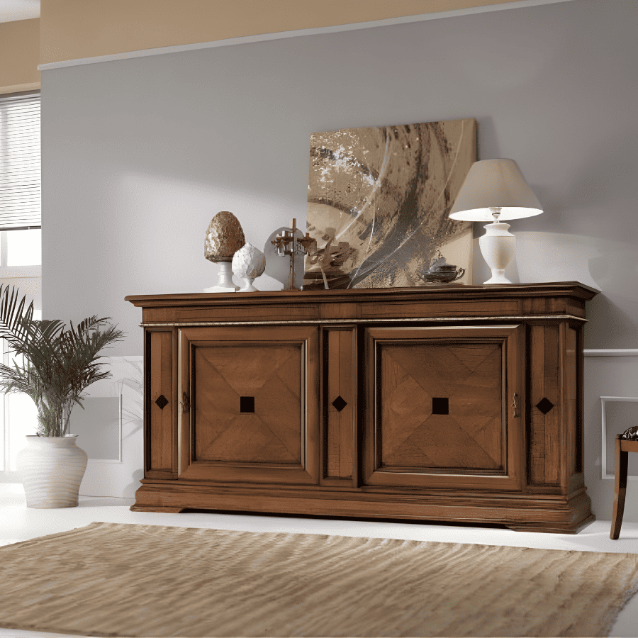 Personalizzazione Epocantica La grande superficie delle ante diventa una tela su cui il colore fa la differenza. Scegli una tinta noce per esaltare le venature del legno in un contesto classico, oppure opta per una finitura laccata o patinata per trasformare questa credenza in una moderna madia di design, adatta anche ai living contemporanei.