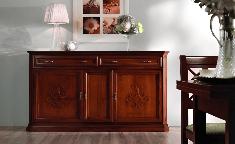 La Credenza Importante (L.196 cm): Larga quasi due metri, questa madia รจ pensata per dominare la parete. Le ante decorate col motivo a giglio nascondono un ampio spazio contenitivo, perfetto per organizzare tutto il necessario per la tavola. Un mobile solido che unisce funzionalitร e bellezza scultorea.